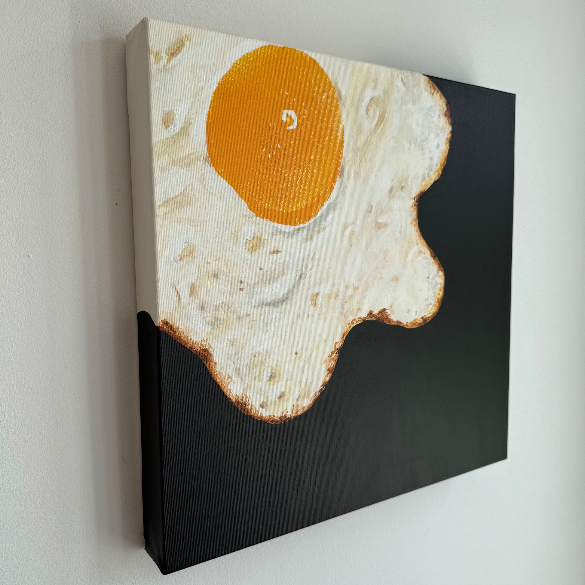 Ein Spiegelei, das zum Kunstwerk wird: Auf tiefschwarzem Hintergrund leuchtet das sinnliche Spiegelei kraftvoll hervor – und offenbart bei genauem Hinsehen ein überraschendes Detail: Das goldene Eigelb wurde nicht klassisch gemalt, sondern sinnlich mit einer weiblichen Brust gestempelt.